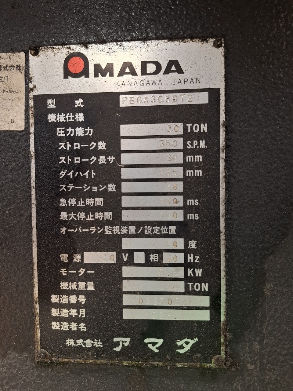 アマダ製 タレットパンチプレス(PEGA367/1996年式)