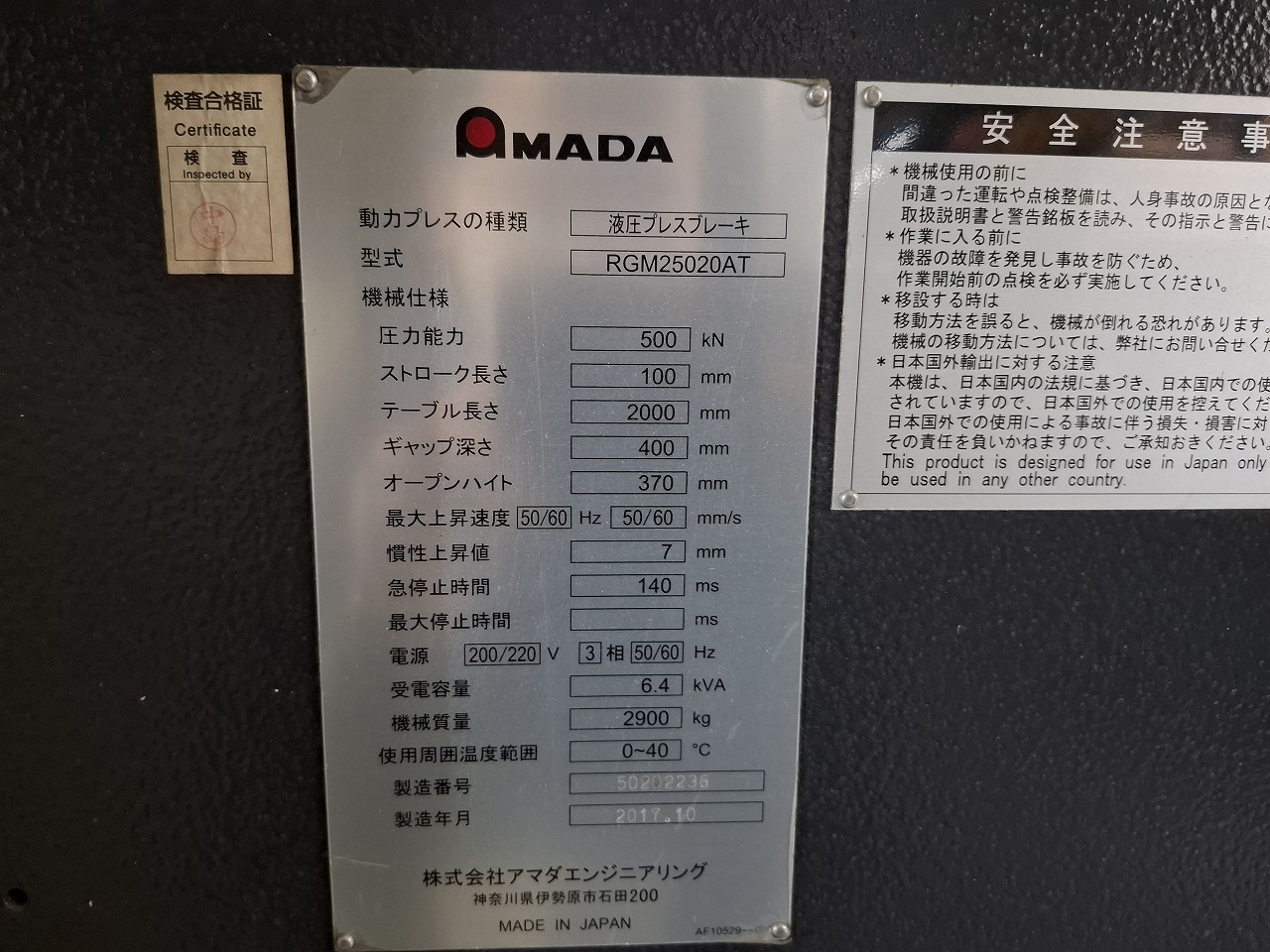 アマダ製 プレスブレーキ(RGMⅡ5020AT/2017年式)