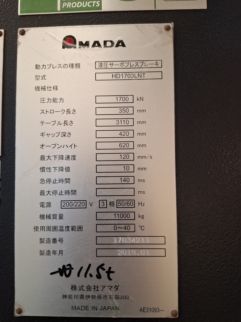 アマダ製 プレスブレーキ(HD1703LNT/2019年式)