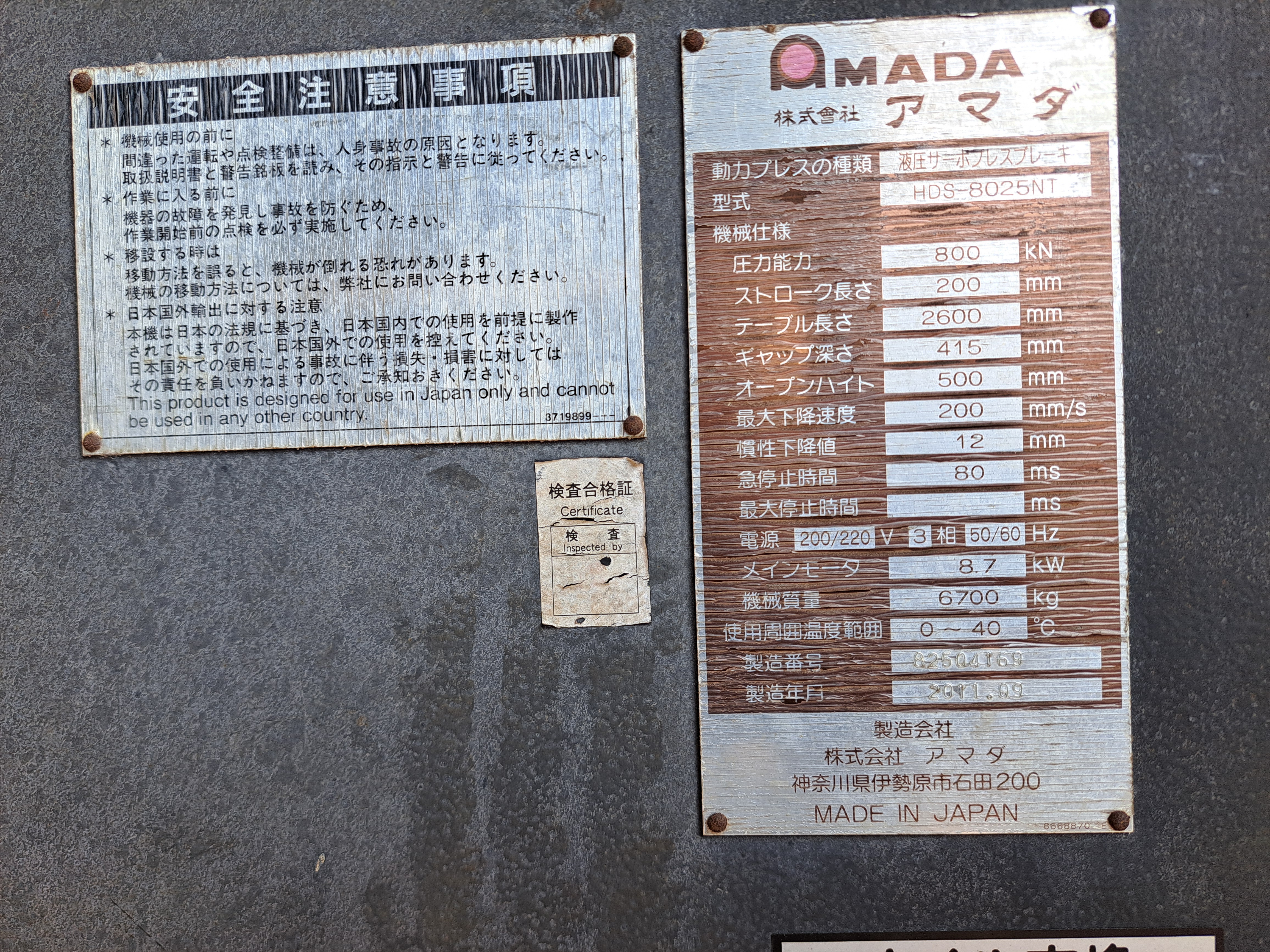 アマダ製 プレスブレーキ(HDS8025NT/2011年式)