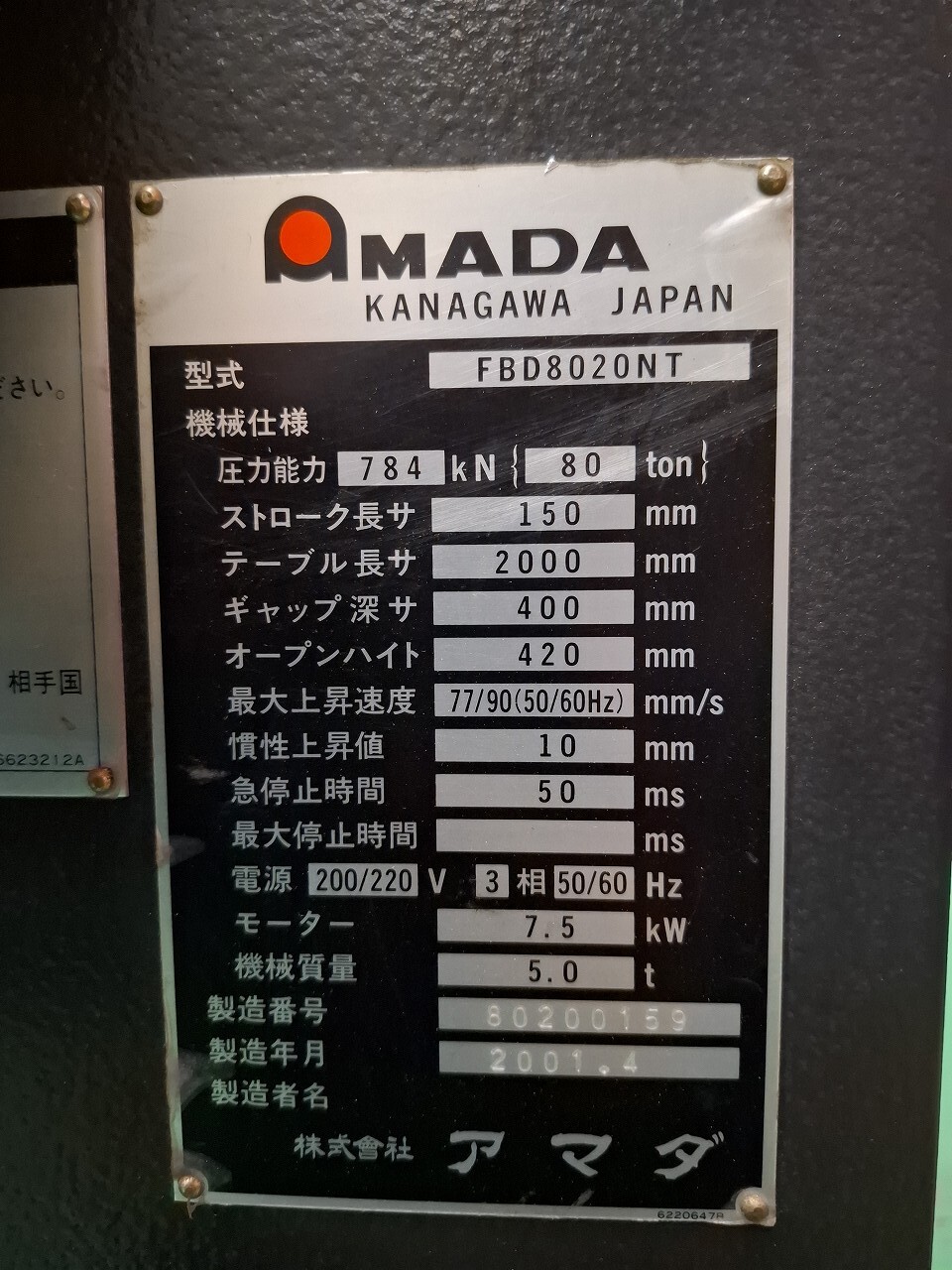 アマダ製 プレスブレーキ(FBD8020NT/2001年式)