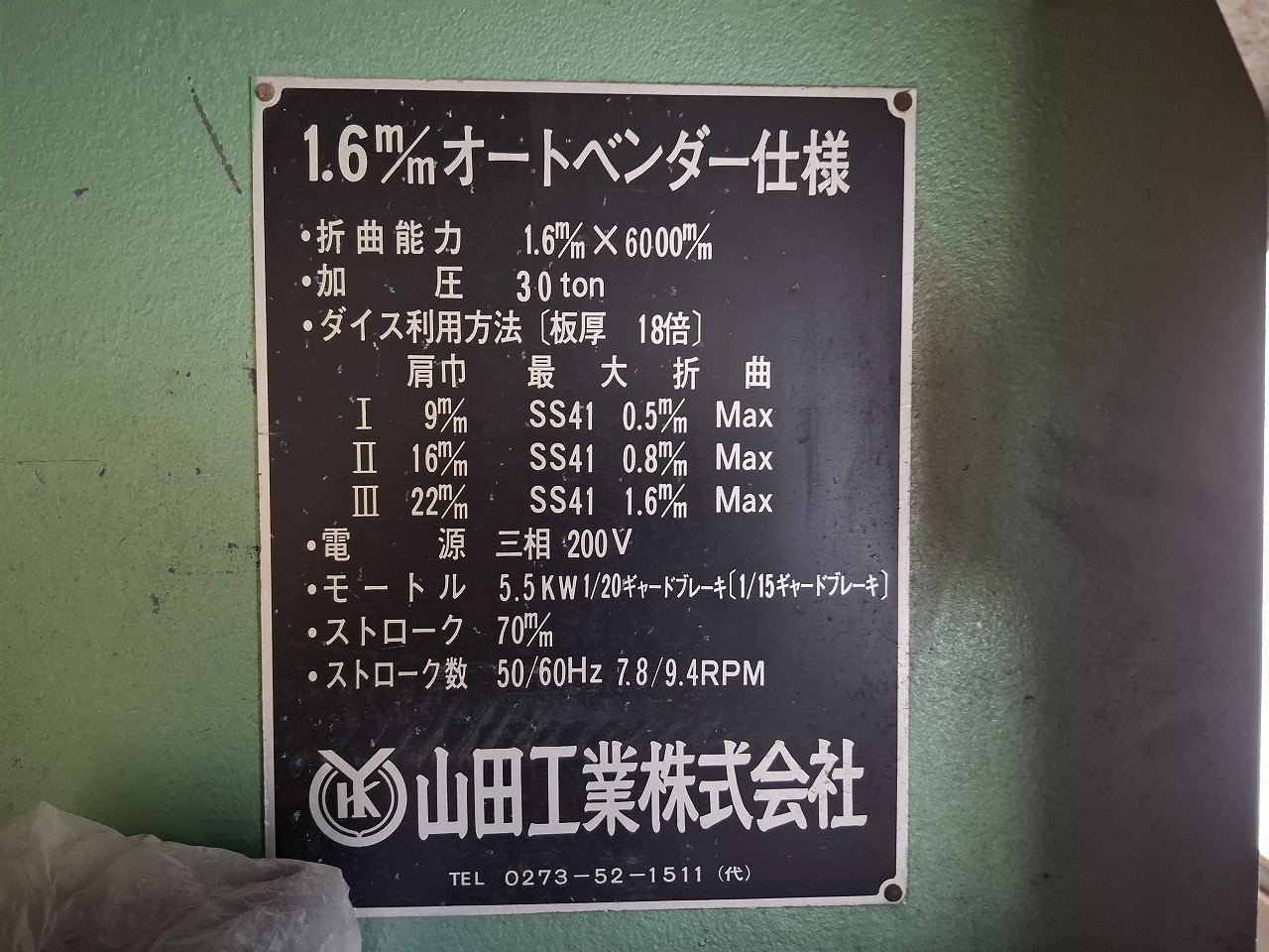 山田工機製 プレスブレーキ(1.6*6000mm/1980年式)