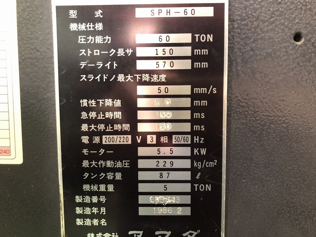 アマダ製 プレスブレーキ(SPH-60/1986年式)